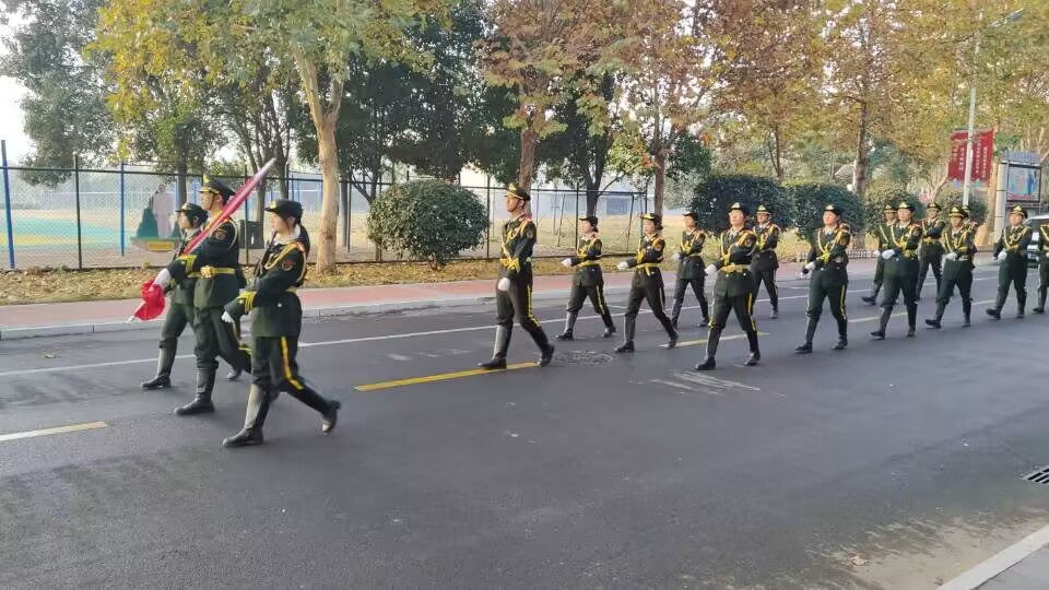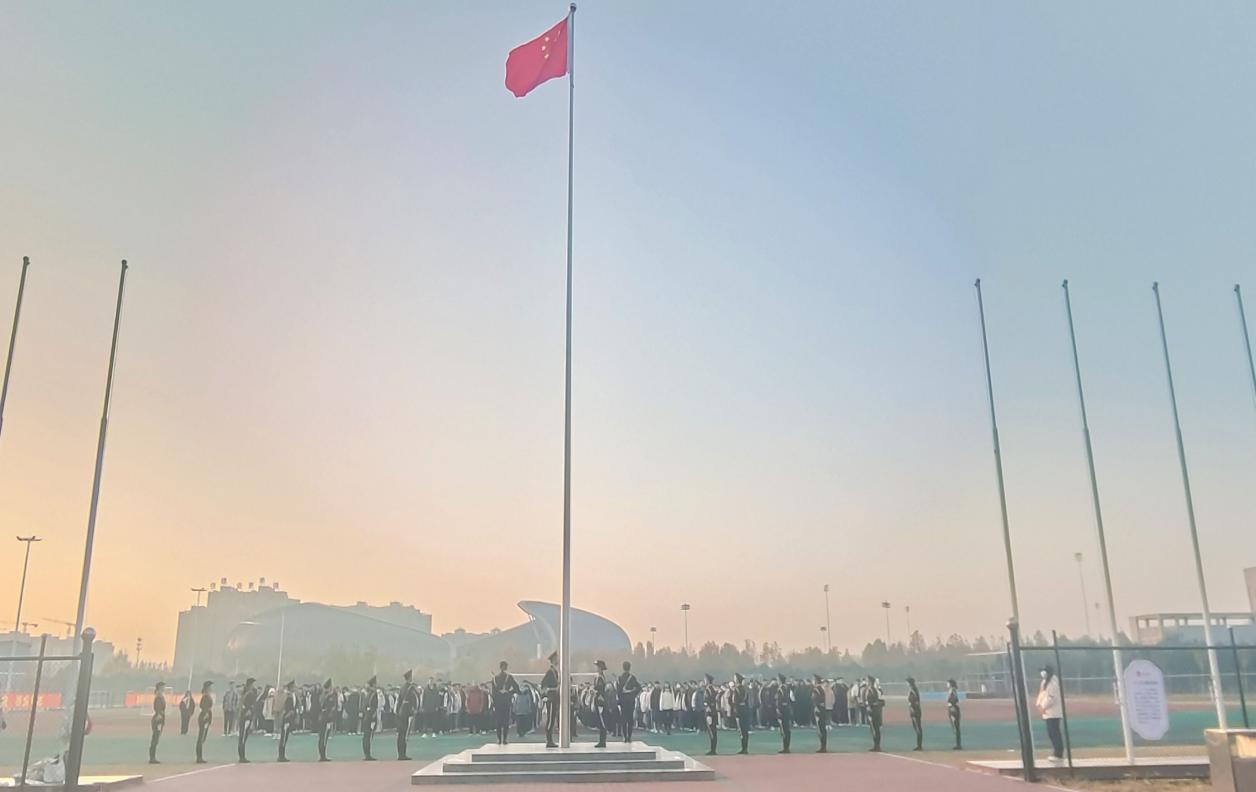 7点30分升旗仪式准时开始,在指挥员的口令下,护旗手昂首挺胸、精神抖擞,迈着整齐的步伐,护送国旗行进至升旗台。庄严的国歌响起,全体师生肃立,注视着五星红旗升向高空。国旗在国歌声中缓缓升至顶端,升旗仪式到此结束。