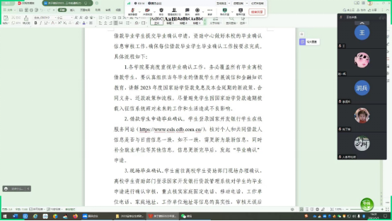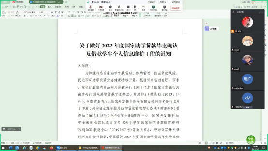 为响应公司公司号召,进一步巩固毕业生的金融教育知识并提高防诈骗意识,2023年5月5日下午,伟德官方网站辅导员张波老师根据《关于做好2023年度国家助学贷款毕业确认及借款员工个人信息维护工作的通知》的要求,对助学贷款毕业生开展了一场线上主题会议。