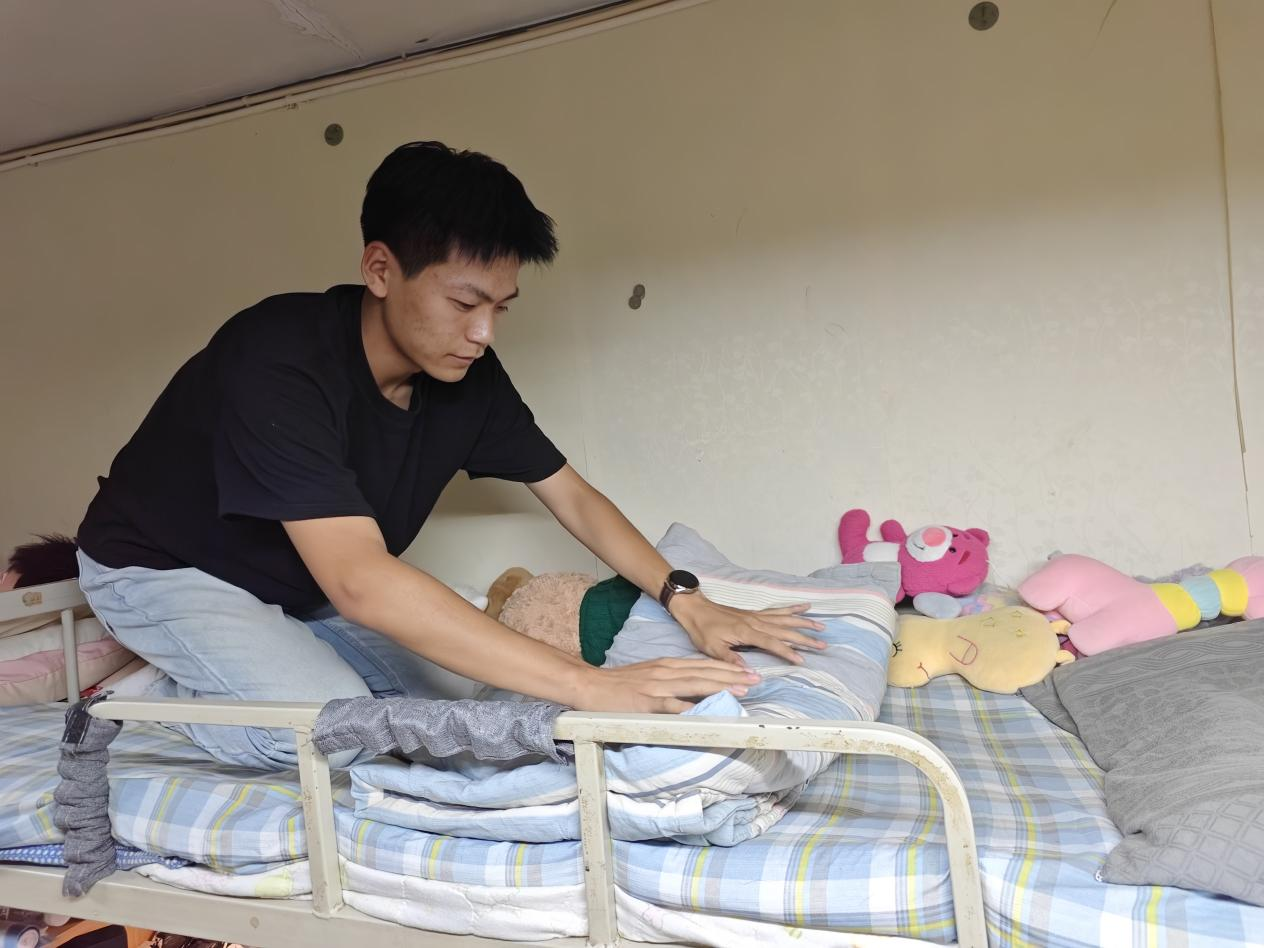 在示范宿舍现场,土木工程专业大二员工崔浩然化身“生活工程师”,演示床铺整理:“被子长边需与床沿保持 90° 垂直,如同建筑墙体的垂直度检测。” 他将叠被过程拆解为 “铺平—压实—折叠—整” 四道工序,每道工序配有 “操作要点”讲解,|“整型环节如同混凝土构件的表面收光,需注重棱角的线条挺拔”。