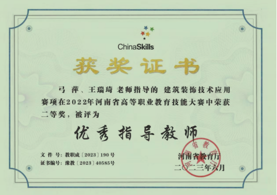 建筑装饰工程技术专业拥有一支结构合理的高素质双师型教师队伍,现有专任教师9人,博士1人,硕士7人,硕士学位教师比例达90%,副教授2人,专业带头人1人,省级骨干教师1人,省级课程思政名师1名;拥有省级精品在线开放课程2门,省级课程思政项目1项,省级教改项目1项,省级规划教材1部,国家级能者为师项目1项。专业教师多次在省级教学技能大赛中获得奖项,指导的员工也多次在河南省高等职业教育技能大赛中获得奖项。